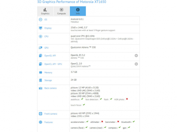 Đặc biệt, bảng thông số cấu hình từ GFXBench còn cho thấy Moto X 2016 sẽ sở hữu cụm camera kép ở mặt lưng gồm 2 camera có độ phân giải lần lượt là 20MP và 12MP, đều có khả năng hỗ trợ quay video chất lượng 4K.