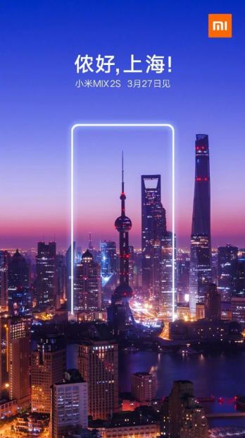 Hình ảnh teaser chính thức cho sự kiện ra mắt Xiaomi Mi Mix 2S được Xiaomi tung ra trên tài khoản mạng xã hội Weibo của họ. Thông tin quan trọng nhất của teaser này là thời gian và địa điểm ra mắt sản phẩm. Theo đó, Xiaomi Mi Mix 2s sẽ được giới thiệu trong một sự kiện tại thành phố Thượng Hải vào ngày 27/3 tới đây.