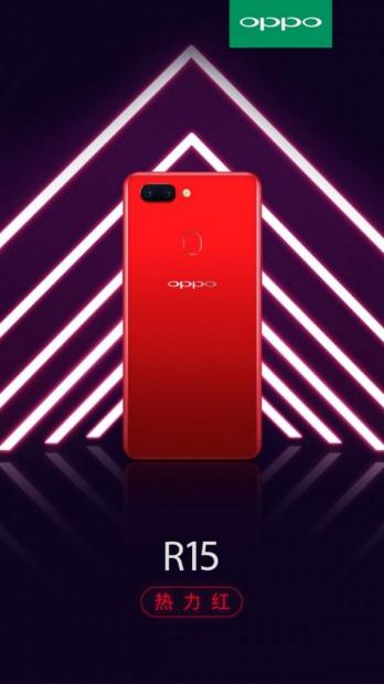 Các hình ảnh báo chí cho thấy OPPO R15 có 3 biến thể màu sắc khác nhau gồm màu đỏ, trắng và tím. Ở mặt sau, bạn sẽ thấy bộ camera kép nằm ngang đặt ở góc bên trái, trong khi cảm biến vân tay hình bầu dục nằm phía trên logo OPPO.