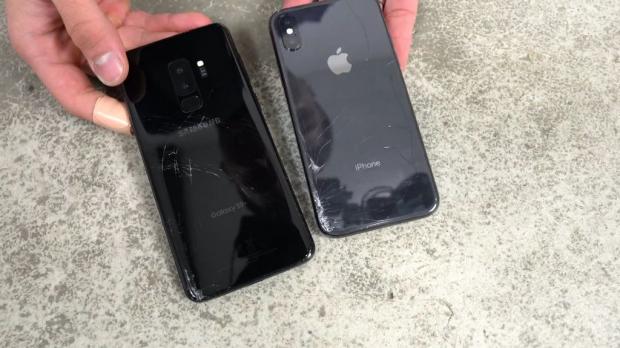 Chuyển qua độ cao 1,5m. Ở mức độ này, thì sau một vài lần thử nghiệm thì có vẻ và Samsung Galaxy S9+ lẫn iPhone X đều phải chịu thất bại như nhau khi mà bắt đầu xuất hiện những vết nứt, vỡ ở mặt kính phía lưng. Tiếp theo đó, với lần thử độ bền cho màn hình thì cũng không mấy khác biệt với các vết nứt, vỡ xuất hiện nhiều hơn, tuy nhiên về chức năng thì cả 2 chiếc điện thoại này đều hoạt động một cách bình thường, không hề xảy ra bất kỳ lỗi nào.