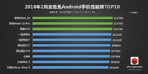 Theo trang Gizmochina, bảng xếp hạng top 10 smartphone hiệu năng mạnh nhất tính đến tháng 2/2018 do Antutu cung cấp không có nhiều thay đổi so với tháng 1. Cụ thể, hai vị trí dẫn đầu trong danh sách những smartphone điểm chuẩn mạnh nhất vẫn là bộ Huawei Mate 10, Mate 10 Pro sử dụng chipset Kirin 970 và cho số điểm lần lượt là 214,750 và 214707. Vị trí thứ ba là mẫu Huawei Honor View 10 với số điểm đạt được trên AnTuTu là 213,758.OnePlus 5 là điện thoại thông minh đầu tiên sử dụng chipset Snapdragon 835 xuất hiện trong danh sách này và đứng ở vị trí thứ 4 với 211,210 điểm. Theo sau mẫu OnePlus 5 là người đàn em OnePlus 5T của nó và điện thoại này đạt 211,029 điểm. Bộ đôi flagship của ZTE bao gồm Nubia Z17 và Z17s lần lượt đứng ở vị trí thứ 6 và 7 với số điểm lần lượt là 208,654 và 207,502 điểm.