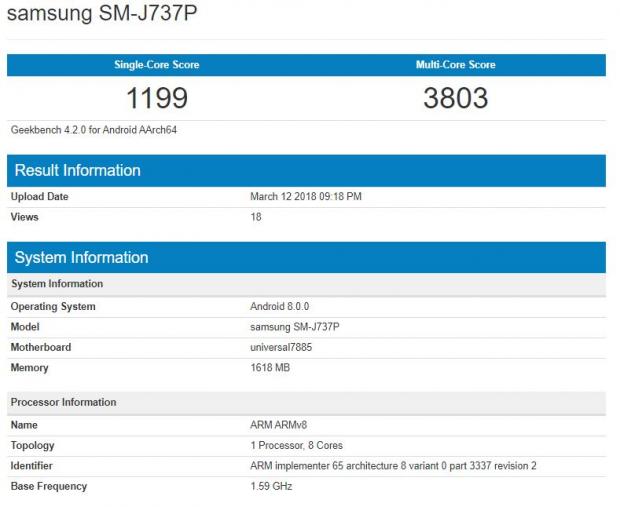 Dường như Samsung chuẩn bị tung ra thế hệ tiếp theo của gia đình Galaxy J, sau khi Galaxy J8 (2018) xuất hiện thì bây giờ đến lượt Galaxy J7 (2018), nó mang số hiệu SM-J737P và bị phát hiện đang được thử nghiệm trên Geekbench.