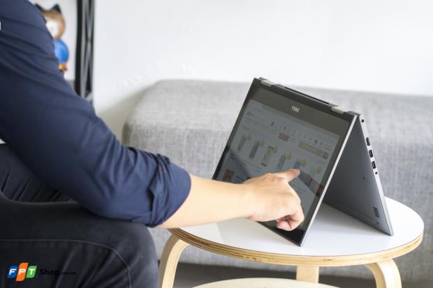 Nếu như MacBook Pro 13' có bản lề bình thường với độ mở không cao, thì Dell Inspiron 13-5368 được hãng trang bị một bản lề đặc biệt giúp máy có khả năng xoay gập màn hình lên đến 360 độ với nhiều tư thế sử dụng khác nhau. Đơn cử, bạn có thể dùng máy như một chiếc laptop hoặc một chiếc máy tính bảng. Dell gọi đây là Multi Mode Hinge - 2 in 1 Device. Với bản lề đặc biệt và màn hình cảm ứng, người dùng có thể dễ dàng sử dụng máy với nhiều hình thức khác nhau. Dưới đây là một vài ví dụ về cách sử dụng Dell Inspiron 13-5368.
