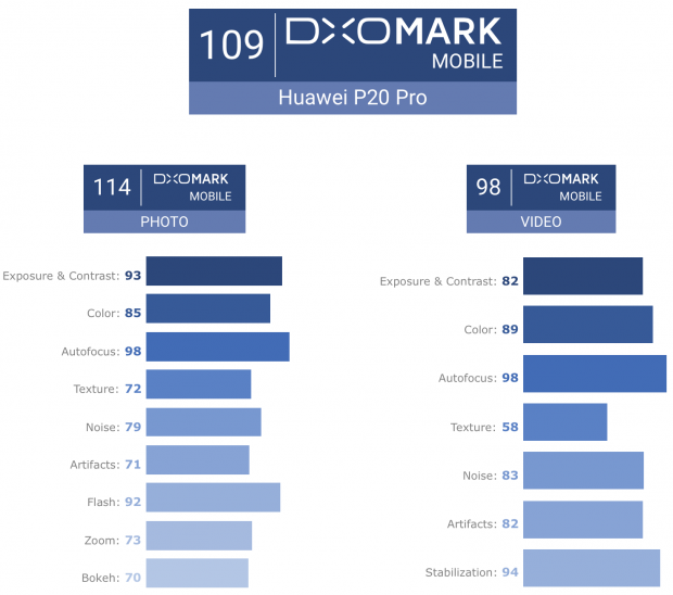 Với điểm số tổng thể 109, đặc biệt điểm số hình ảnh là 114 thì Huawei P20 Pro cao hơn những đổi thủ chính như Google Pixel 2, Apple iPhone X hay Samsung Galaxy S9+ một khoảng rất lớn, có thể lên đến 10 điểm hoặc hơn. Với việc kết hợp cảm biến RGB lớn, độ phân giải cao với cảm biến trắng đen thì hình ảnh thu được từ P20 Pro cực tốt khi chụp thiếu sáng, dải tương phản động là tốt nhất. Ngoài ra thì ống kính 80mm, kết hợp với 2 cảm biến trên cũng giúp P20 Pro có khả năng zoom tốt nhất trong số tất cả các smartphone đến hiện tại, hiệu ứng giả lập bokeh của nó cũng cực kỳ tốt.