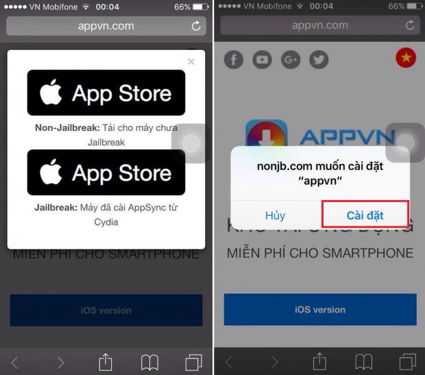 Các bạn chọn phiên bản phù hợp với iPhone của mình (máy chưa và đã jailbreak) để tải về > bấm vào Cài đặt.