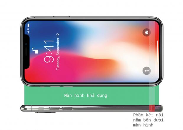 Bằng cách bẻ cong màn hình, đưa phần kết nối vào giữa máy, nằm dưới màn hình nên cạnh dưới iPhone X rất mỏng và tương ứng với 4 cạnh còn lại.