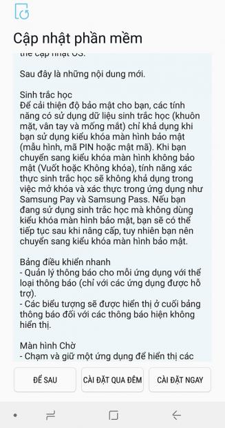Được biết bản cập nhật lần này cũng bao gồm bản vá bảo mật Android tháng 3 và giao diện Samsung Experience 9.0.