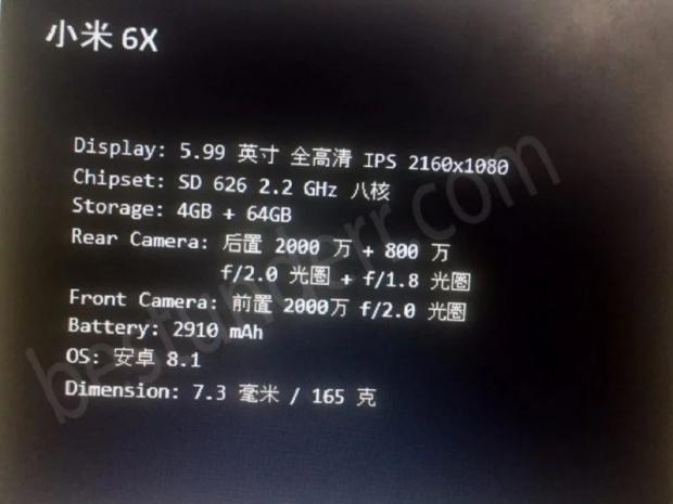 Theo thông tin đề cập, máy sẽ trang bị màn hình 5.99 inch Full HD+ tỉ lệ 18: 9, bộ vi xử lý Snapdragon 626 kết hợp với 4 GB RAM và 64 GB bộ nhớ trong.