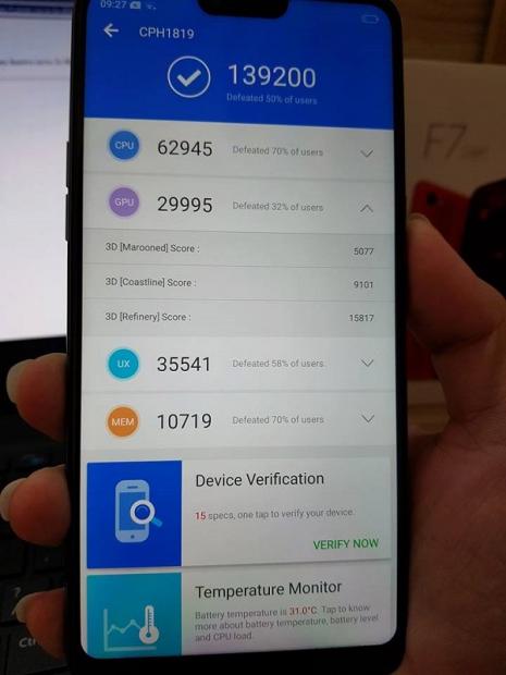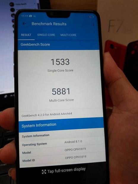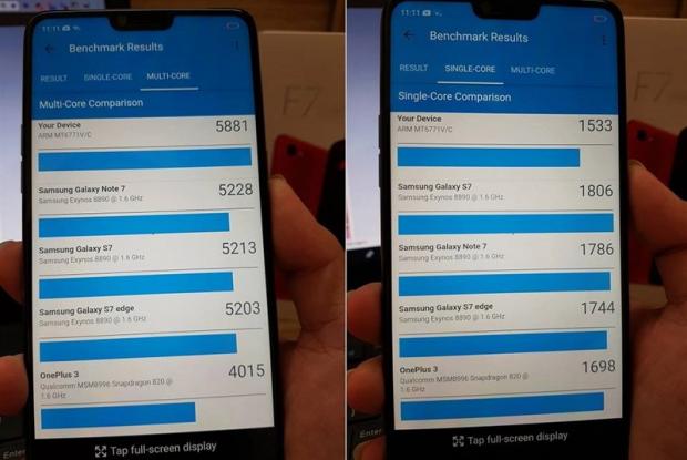 Theo đó, OPPO F7 có điểm AnTuTu đạt hơn 139.000 điểm, trong khi điểm số hiệu năng đơn lõi trên Geekbench là 1.533 điểm, đa lõi đạt 5.881 điểm. Đây là mức điểm số hết sức ấn tượng đối với một smartphone tầm trung.