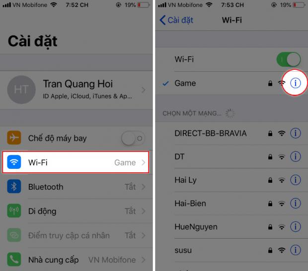 Bước 1: Trên thiết bị chạy iOS, bạn truy cập vào Cài đặt > Wi-Fi > Bên cạnh biểu tượng mạng bạn chọn vào 'i'.