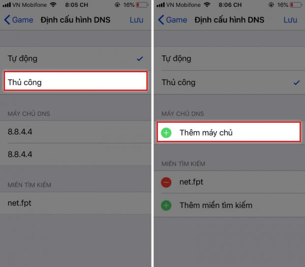 Bước 2: Chuyển trạng thái DNS tự động sang thủ công > Sau đó chọn vào thêm máy chủ.