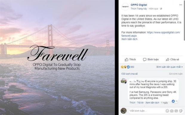 Thông tin OPPO Digital ngừng sản xuất tai nghe chất lượng cao, đầu Blu-ray và UDP 4K được đăng tải trên Fanpage chính thức của hãngNgoài ra, OPPO Digital vẫn sẽ tiếp tục phát hành các bản cập nhật firmware cho người dùng. Các thiết bị mới hơn như đầu phát đĩa OPPO UDP-203 Blu-ray 4K Ultra-HD, và đầu phát OPPO UDP-205 Audiophile Blu-ray 4K UHD cũng nhận được các bản cập nhật firmware thường xuyên. Tuy nhiên, người dùng thiết bị cũ hơn sẽ chỉ nhận được bản cập nhật quan trọng.