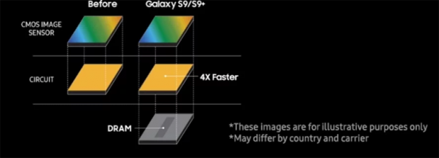 Theo Gizmochina dẫn lại, giải pháp của Samsung chính là một mô-đun camera với 3 lớp xếp chồng lên nhau. Samsung đã bổ sung một chip bộ nhớ DRAM dành riêng cho bộ cảm biến CMOS và mạch điện mới. Vì vậy, Galaxy S9 sở hữu cảm biến ba lớp thay vì hai lớp ở Galaxy S8, đây chính là bí ẩn đằng sau tính năng “buttery-smooth, Super Slow-mo videos” (chế độ quay video slow-motion siêu mượt) của Galaxy S9.