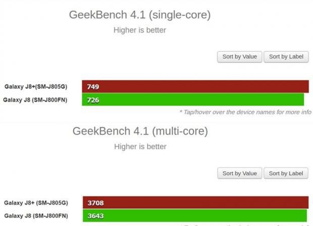 Trong khi đó, Galaxy J8+ (tên mã SM-J805G) lại được trang bị bộ vi xử lý của Qualcomm là Snapdragon 625 kết hợp với dung lượng RAM 4GB. Mặc dù sở hữu bộ vi xử lý khác nhau nhưng điểm hiệu năng của hai mẫu smartphone tại GeekBench không chênh lệch nhau quá nhiều.