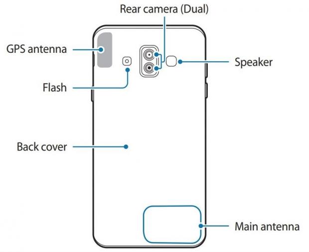 Pin và ốp lưng phía sau của Galaxy J7 (2018) có thể tháo rời và thay thế. Có 2 camera sau, đèn LED Flash, loa ngoài và Ăng-ten GPS.