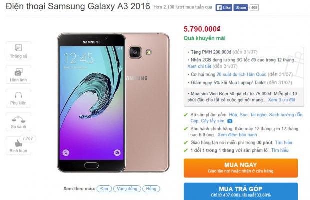 Cụ thể, Galaxy A3 2016 đã được giảm giá từ 6.19 triệu xuống còn 5.79 triệu, giảm 400 ngàn đồng, mức giảm không nhiều nhưng cũng đủ để khích lệ người mua. Ngoài ra, khi mua sản phẩm này bạn còn nhận được 2 GB dung lượng 3G trong 12 tháng (áp dụng đến hết ngày 31/7).