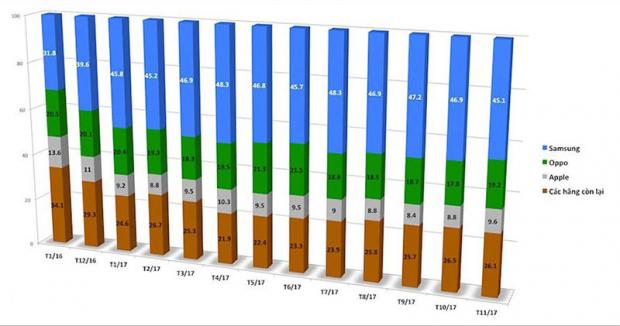 Thị phần các hãng từ tháng 11/2016 đến tháng 11/2017Để đạt được thành quả này, OPPO đã bỏ ra rất nhiều chi phí dành cho marketing và quảng cáo, nhưng tất cả sẽ vô nghĩa nếu sản phẩm của họ không tốt. Theo dõi đoạn clip trên, chúng ta có thể thấy điện thoại OPPO được sản xuất và kiểm tra vô cùng tỉ mỉ nhằm đảm bảo chất lượng thành phẩm, đáp ứng yêu cầu khắt khe từ phía người dùng.