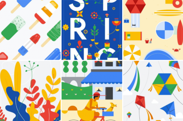Các hình nền đều có chủ đề mùa xuân với màu sắc rực rỡ và hình ảnh thiên nhiên cùng các hoạt động bên ngoài.