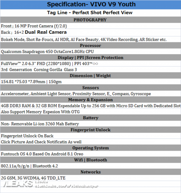 Thay vì sử dụng bộ vi xử lý Snapdragon 626 giống như trên Vivo V9, thì V9 Youth chỉ dùng chip Snapdragon 450 như trên Xiaomi Redmi 5 và Huawei Y6 (2018).