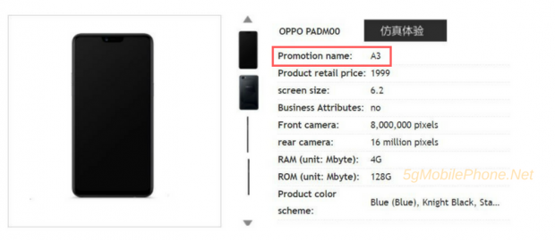 Dẫn lại từ AndroidHeadlines, OPPO A3 sẽ chạy trên nền hệ điều hành Android 8.1 với chip MediaTek Helio P60 tầm trung, pin có dung lượng 3.300 mAh, hỗ trợ chế độ làm đẹp và khả năng tương thích 4G LTE. Kích thước chiếc smartphone này là 56 × 75.3 × 7.8 mm, trọng lượng 159g với các phiên bản màu sắc Knight Black, Soybean Meal, Blue, Stardust Silver, và Pomegranate.