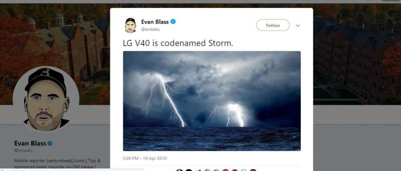 Theo “thánh rò rỉ” Evan Blass (@evleaks), một chiếc LG V40 đang được sản xuất và nó có tên mã là Storm. Chiếc điện thoại này sẽ là một sự kế thừa từ LG V30 năm ngoái.