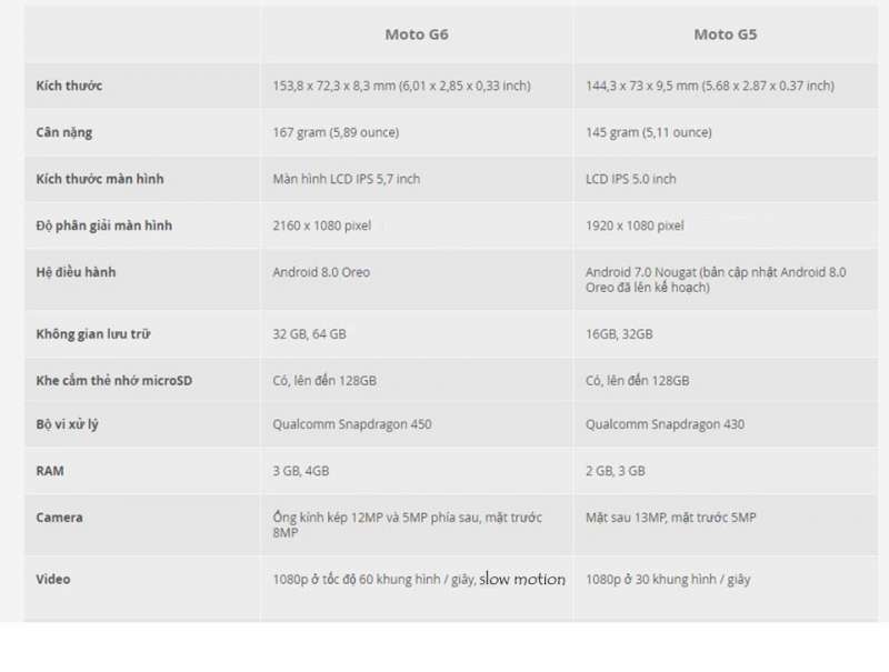 Bảng so sánh nhanh thông số kỹ thuật chính giữa Moto G6 và Moto G5