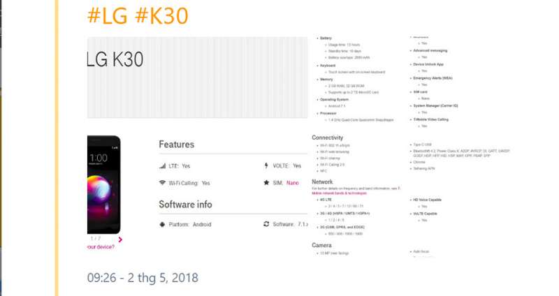 Dù chỉ mới trình làng mẫu flagship LG G7 ThinQ ngày hôm qua nhưng LG được cho là đang lên kế hoạch ra mắt nhiều thiết bị mới, trong đó có mẫu smartphone tầm trung LG K30. Mới đây, điện thoại này vừa xuất hiện trên trang web hỗ trợ của nhà mạng T-Mobile, Mỹ qua đó để lộ gần như toàn bộ thông tin cấu hình của máy.