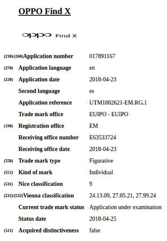 Bây giờ, cái tên OPPO Find X đã được đăng ký nhãn hiệu gần đây và thông tin trên hồ sơ cho thấy ngày nộp đơn của công ty Trung Quốc là 23 tháng 4. Đây có thể được xem là một bằng chứng cụ thể nhất cho sự xuất hiện của OPPO Find X trong tương lai. Tuy nhiên, đáng tiếc là ngoài tên gọi thì danh sách này không chia sẻ bất kỳ thông số kỹ thuật nào của điện thoại này. Tuy nhiên, dựa vào tên gọi thì nhiều khả năng đây sẽ là mẫu flagship thật sự tiếp theo của OPPO bởi trước đó các thiết bị mạnh nhất của công ty trong vài năm trở lại đây chỉ sử dụng chipset Snapdragon 600 series của Qualcomm.