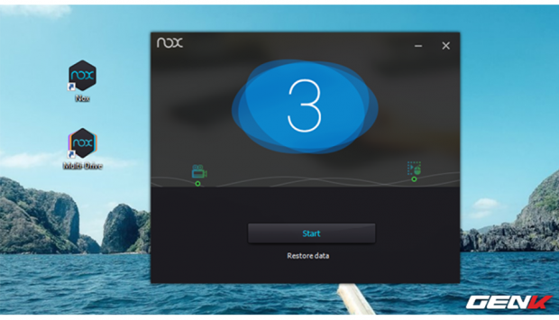 Sau khi hoàn tất quá trình cài đặt, trong giao diện desktop máy tính của bạn sẽ hiển thị 2 biểu tượng là Nox và Multi-Drive. Bạn hãy khởi động Nox lên và chọn “Start”.