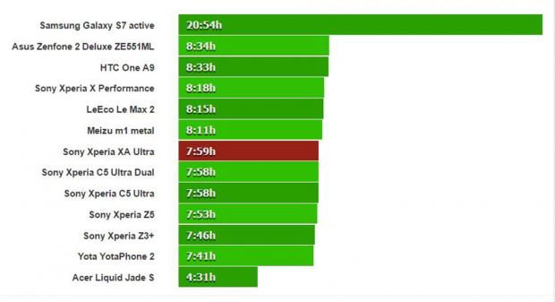 Mặc dù vậy khi đem so sánh Xperia XA Ultra với các điện thoại khác có cùng kích cỡ hoặc lớn hơn nữa như là Samsung Galaxy A9 Pro (6 inch), Xiaomi Mi Max (6.4 inch) hay OPPO R7 Plus (6 inch) thì nó lại thua kém khá nhiều. Ví dụ trong cùng thử nghiệm, Galaxy A9 Pro cho kết quả ấn tượng với hơn 16h phát video liên tục hay 14h duyệt web trong khi đó Xiaomi Mi Max đạt con số là 20h duyệt web và 16h xem video liên tục còn OPPO R7 Plus thì cũng cho thời gian duyệt web lên tới 11h.