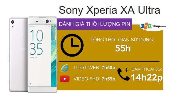 Để cho công bằng nhất thì chuyên trang gsmarena đã làm một bài kiểm tra thực tế thời lượng sử dụng pin trên chiếc phablet mới của Sony. Cụ thể, Xperia XA Ultra thể hiện khá ổn, bạn có thể nhận được khoảng 8h duyệt web hay xem video. Tổng thời gian sử dụng pin hỗn hợp trên điện thoại đạt được là 55h - con số đủ để kéo dài tới 2 ngày sử dụng trung bình. Chuyên trang này cũng nhận định rằng Xperia XA Ultra đã cho kết quả ấn tượng hơn nhiều so với 2 người anh em là Xperia X và X Performance trong cùng một bài test.