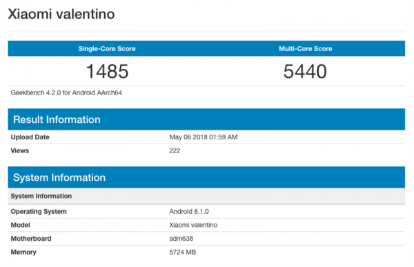 Cụ thể hơn, thông tin về Xiaomi Valentino xuất hiện trên chuyên trang đo điểm chuẩn Geekbench, không chỉ hé lộ model chip xử lý mà còn cho biết máy có dung lượng RAM 6 GB và chạy hệ điều hành Android 8.1 Oreo.