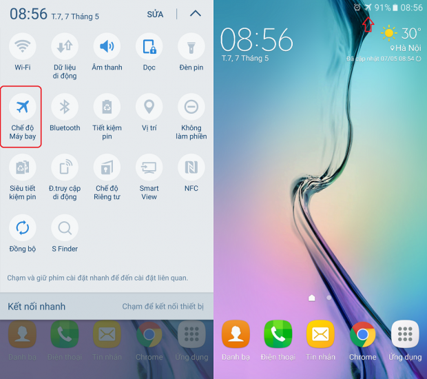Đừng để những giây phút thư giãn ít ỏi cuối tuần của bạn bị ảnh hưởng bởi những thứ không đáng có. Trên Samsung Galaxy A9 Pro, bạn chỉ cần vuốt nhanh từ cạnh trên của màn hình xuống, chạm vào nút mũi tên trên góc phải để rộng thanh công cụ rồi chọn 'Chế độ Máy bay', mọi vấn đề đều sẽ được giải quyết một cách nhanh chóng.