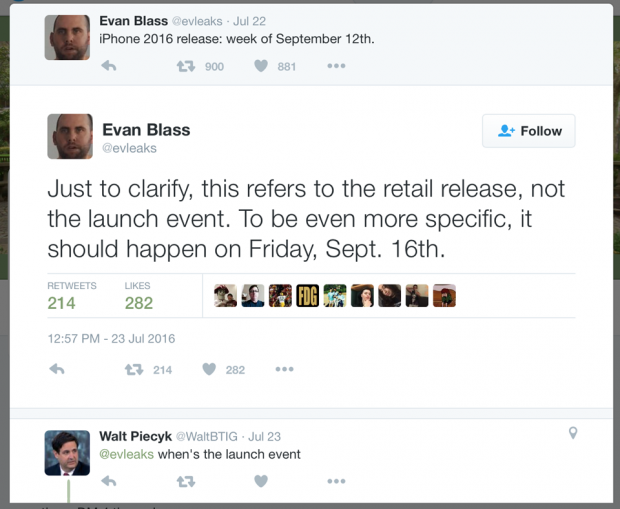 So với thông tin về thời gian ra mắt mà trước đó Evan Blass đã tiết lộ là giữa tháng 9 (từ 12-17/9), ban đầu giới công nghệ đều nghĩ đây là khoảng thời gian sẽ diễn ra sự kiện thường niên ra mắt iPhone mới. Nhưng ngay sau đó @evleaks đã đăng một thông báo khác để làm rõ thời gian, và anh ta xác nhận rằng 16/9 là thời điểm iPhone 7 được bán ra, không phải thời gian diễn ra sự kiện ra mắt. Có thể thời gian ra mắt sẽ trước 16/9 một vài ngày. Thông thường Apple sẽ ra mắt thế hệ iPhone mới vào tháng 9 và bán nó vào tháng 10, do đó những thông tin mà Evan Blass vừa mới tiết lộ khiến giới công nghệ khá bất ngờ.
