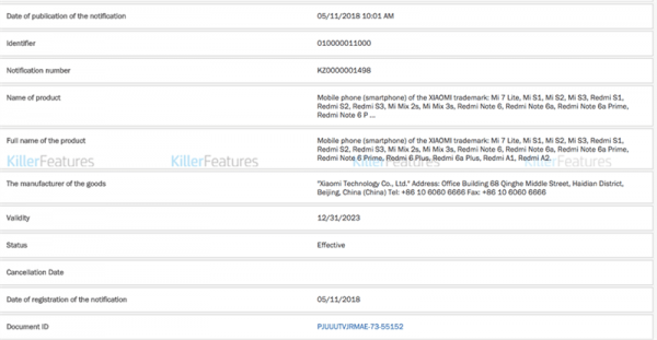 Danh sách các sản phẩm của Xiaomi (được phát hành và hầu như chưa được phát hành) đã xuất hiện trực tuyến thông qua trang web của Ủy ban Kinh tế Á-Âu, đề cập đến một loạt các điện thoại chưa được phát hành thuộc dòng Mi và Redmi. Trong đó bao gồm cả Mi MIX 2s đã được tung ra và phiên bản mới của Redmi S2.