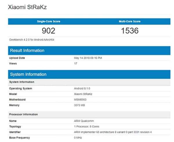 Theo đó, thiết bị này được trang bị chip Snapdragon 625 và 4 GB RAM. Đây có thể sẽ là một sản phẩm thuộc dòng Redmi. Bên cạnh đó, Xiaomi StRaKz còn đạt 902 điểm trong bài kiểm tra đơn lõi và 1536 điểm trong bài kiểm tra đa lõi.