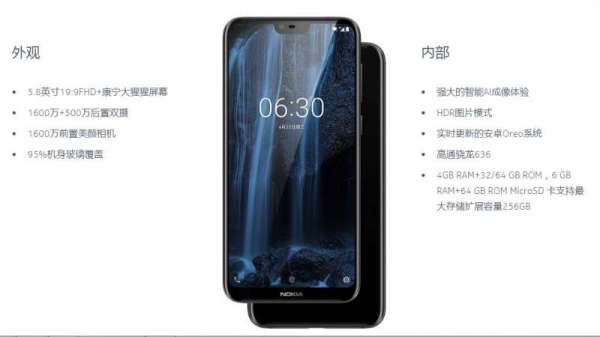 Nokia X6 sở hữu màn hình LCD IPS kích thước 5.8 inch, độ phân giải FullHD+ và theo tỷ lệ 19:9. Cung cấp sức mạnh cho thiết bị sẽ là vi xử lý Snapdragon 636, RAM tùy chọn 4GB/6GB và bộ nhớ trong 32/64GB. Khi được bán ra, thiết bị sẽ chạy trên hệ điều hành Android 8.0 Oreo cùng viên pin 3060mAh hỗ trợ công nghệ sạc nhanh.