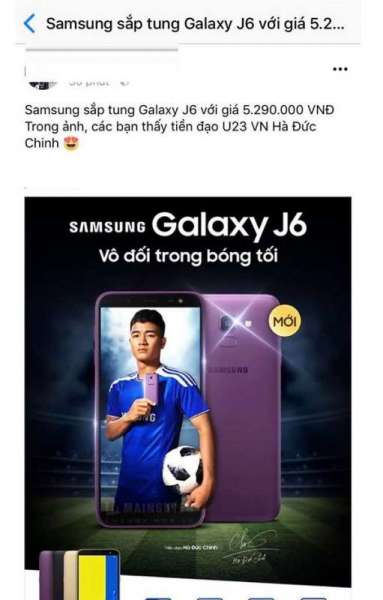 Theo hệ thống bán lẻ này thì giá bán của Galaxy J6 tại Việt Nam sẽ là 5.29 triệu đồng. Ngoài ra, hình ảnh đăng tải đi kèm cũng cho thấy tiền đạo trẻ Hà Đức Chinh sẽ là đại diện của thương hiệu Galaxy J6.
