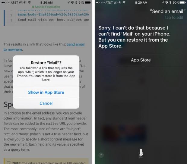 Hiện nay, Apple không cung cấp một phương tiện để thiết lập ứng dụng của bên thứ 3 như các ứng dụng mặc định. Có nghĩa là nếu bạn xóa ứng dụng Mail và sử dụng Outlook hoặc Gmail để thay thế thì sẽ làm mất chức năng khi sử dụng Siri. Ví dụ, bạn sẽ không thể ra lệnh cho: “Siri, give an email” vì khi đó Siri sẽ nhắc bạn cài lại ứng dụng Mail. Một thông điệp tương tự cũng sẽ được gửi đến khi bạn gõ vào một địa chỉ email nào đó.