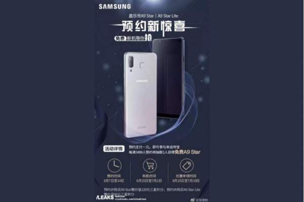 Trong poster quảng cáo vừa xuất hiện, nó cho thấy Galaxy A9 Star sẽ ra mắt vào ngày 7/6 tại Trung Quốc, sau đó khách hàng có 1 tuần để đăng ký mua trong đợt flash sale vào ngày 15/6 và kết thúc vào 1/7.