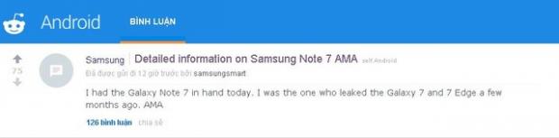 Phải đến ngày 3/8 tới chiếc Samsung Galaxy Note 7 mới chính thức trình làng nhưng một tài khoản có tên Samsung trên mạng xã hội Reddit đã mở một chủ đề AMA (Ask Me Anything) để lời tất cả các câu hỏi về chiếc Galaxy Note thế hệ mới. Điều đặt biệt là thành viên này khẳng định anh ta (tạm gọi như vậy) đang có trên tay siêu phẩm này.