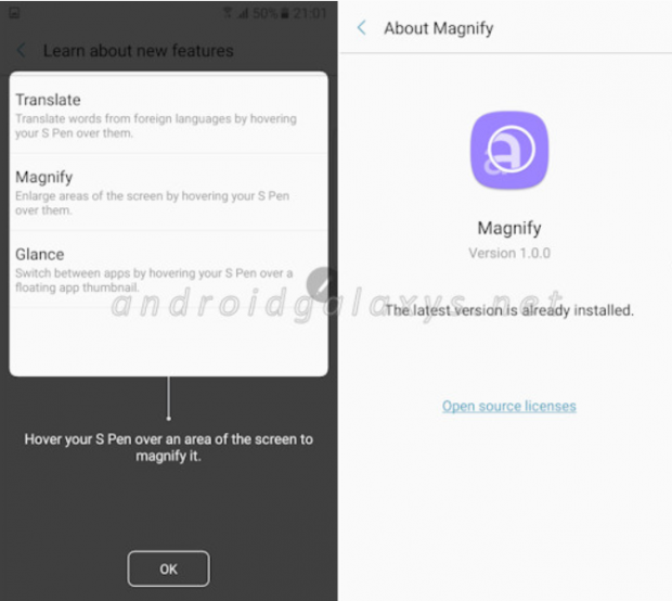Tiếp theo, Magnify là tính năng cho phép người dùng sử dụng S-Pen di chuyển hoặc nhấn vào bất kỳ vị trí nào để phóng to nội dung đó trên màn hình, kể cả khi ứng dụng đó không hỗ trợ việc phóng to, ví dụ như khi duyệt web mà trang web đó không được tối ưu cho chức năng này hoặc khi đang chơi game chẳng hạn.