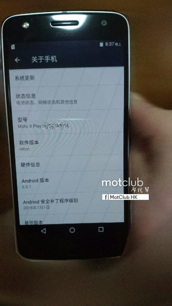 Ngoài hai bức hình rõ nét cho thấy thiết kế mặt sau cũng như thông tin sản phẩm, hình ảnh thứ ba cho thấy giao diện trên thiết bị cầm tay nay. Có vẻ như máy sẽ chạy Android 6.0.1, (điều này gợi ý rằng Moto Z Play sẽ ra mắt trước sự kiện giới thiệu Android 7.0 dự kiến diễn ra vào tháng 8 này) và không có cảm biến vân tay như Z hay Z Force.
