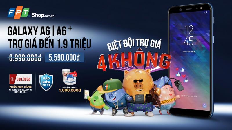 Khi mua trợ giá điện thoại Galaxy A6 tại , bạn chỉ phải trả 5.590.000 đồng, rẻ hơn 1.400.000 đồng. Bạn còn được tặng sim khủng và chỉ cần nạp tiền cước 199.000 đồng/tháng vào sim mới này, bạn sẽ nhận được những ưu đãi hấp dẫn bao gồm 3G với dung lượng khủng 3GB, miễn phí cuộc gọi nội mạng dưới 10 phút, thoải mái gọi điện, nhắn tin. Bên cạnh đó, bạn còn được nhận phiếu mua hàng trị giá 500.000đ và bộ quà tặng Galaxy trị giá 1.000.000đ đến hết ngày 30/6.