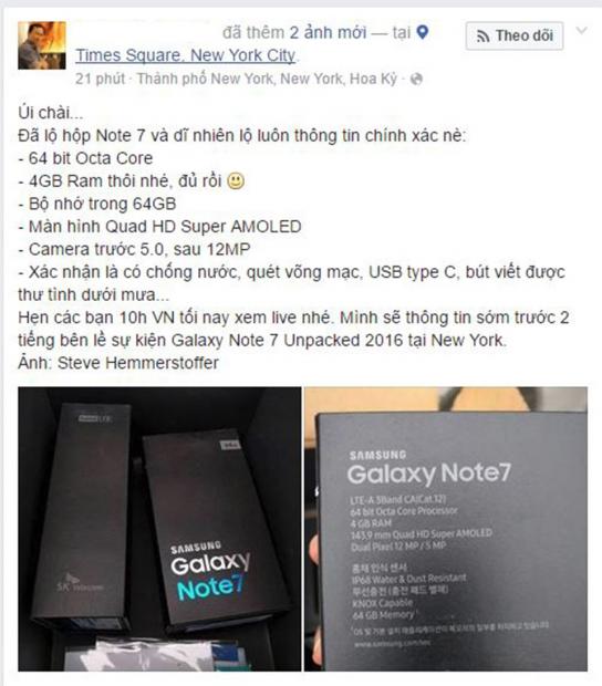 Chỉ còn vài tiếng đồng hồ nữa thì Galaxy Note 7 - chiếc phablet cao cấp tiếp theo của Samsung sẽ được giới thiệu chính thức. Mới đây nhất, sau nhiều tin đồn về thông số kĩ thuật của Galaxy Note 7 thì một tài khoản Facebook uy tín về công nghệ đã đăng tải một số hình ảnh xác nhận chính xác những gì chúng ta còn đang thắc mắc.
