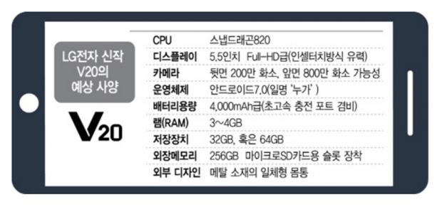 Hôm nay, thông số kĩ thuật của LG V20 đã lộ diện qua một bức ảnh khá đặc biệt là mặt của một chiếc điện thoại. Cụ thể thì, nó cho biết rằng LG V20 là smartphone cao cấp tiếp theo của hãng điện thoại xứ sở Kim Chi. Điện thoại sẽ được trang bị màn hình 5.5 inch Full HD (1920 x 1080 pixels), chip xử lý 4 nhân Qualcomm Snapdragon 820, chip đồ họa Adreno 530, 3 hoặc 4GB RAM, 32GB hoặc 64GB bộ nhớ trong có thể mở rộng thêm 256GB qua thẻ nhớ.