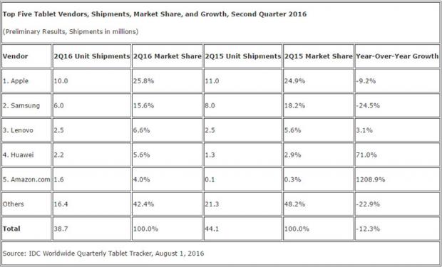 Xét về hãng công nghệ bán được nhiều tablet nhất, Apple và Samsung lại tiếp tục chia nhau hai vị trí dẫn đầu nhưng người nên lo lắng lại là 'nhà Sam', khi trong quý II/2015 họ bán được đến 8 triệu chiếc tablet nhưng năm nay chỉ được 6 triệu chiếc. Điều này làm mức giảm sút của Samsung đạt đến 24% trong khi Apple chỉ chịu mức giảm 9.2% mà thôi.