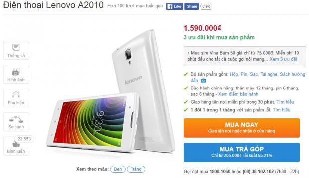 Cuối cùng là mẫu smartphone giá rẻ, Lenovo A2010, smartphone này giảm giá khá nhẹ nhàng, từ 1.69 triệu xuống còn 1.59 triệu, giảm 100 ngàn đồng mà thôi. Chi tiết và đặt mua tại đây.