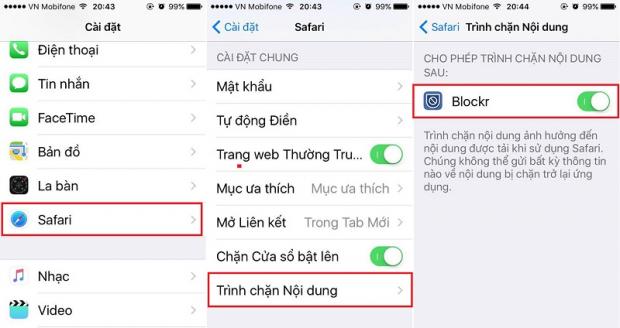 Sau khi cài đặt 1 trong các ứng dụng trên, các bạn vào Cài đặt > Safari > Trình chặn nội dung và kích hoạt ứng dụng chặn quảng cáo vừa cài đặt là xong.