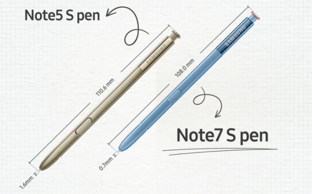 Bút S-Pen thế hệ mới cũng đã được thiết kế lại ngắn hơn 2.6 mm so với bút S-Pen cũ, đầu bút cũng đã nhỏ hơn với kích thước là 0.7 mm (so với 1.6 mm trên Note 5). Những thay đổi này được Samsung giới thiệu là sẽ cho cảm giác viết chân thật như trên giấy thường.